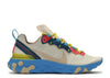 Nike React Element 55 in a sophisticated color combination of tan, blue, and red. Elevate your street style with these eye-catching sneakers that feature a unique design and superior comfort. Perfect for adding a vibrant touch to any outfit, these shoes are a must-have for any sneaker lover.