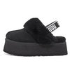 Perhaps the most unique feature is the elastic band at the back of this UGG Funkette platform adorned with the UGG logo in white letters on a black background, adding a modern graphic touch and a recognizable design element. This feature not only provides additional support but also emphasizes the contemporary design of the slipper.